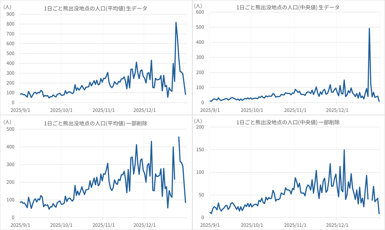 熊出没情報と人口データを紐付けて、1日ごとにグループ化し、平均値と中央値を出したものです。