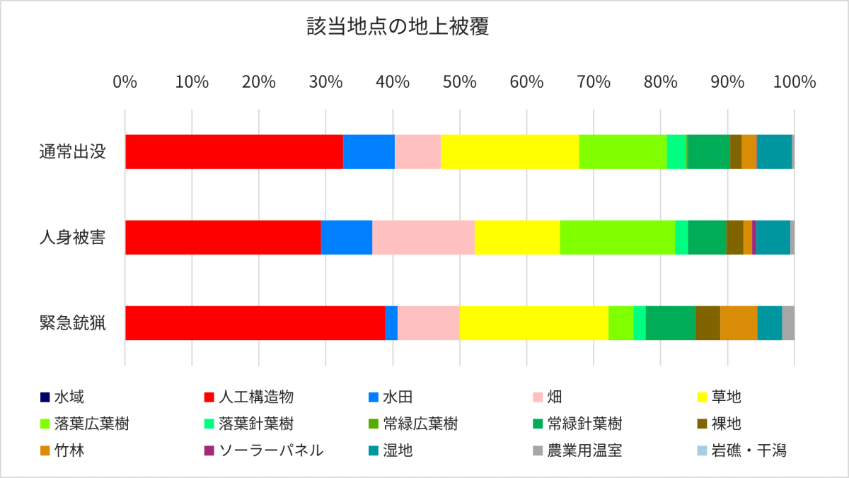 緊急銃猟発生地点近くに偶然建物があったとするよりは、建物の割合が優勢な地点で出没があったように見えます。