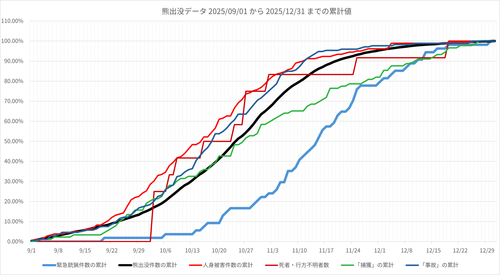 単純に開始が遅れたなら終息時期は熊出没件数と連動しそうですが、実際には累計が90%に達する時期も1か月くらいの遅れがありました。